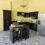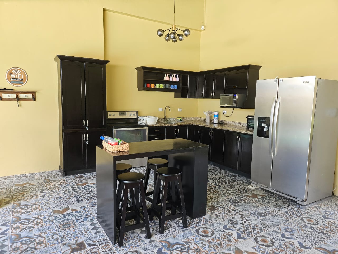 Cocina amplia completamente equipada con desayunador, cocina, refrigerador, horno de microhondas, coffee maker, licuadora, hornito, utelsilios de cocina, ollas, sartenes, cubiertos, vasos y vajilla para 18 personas.